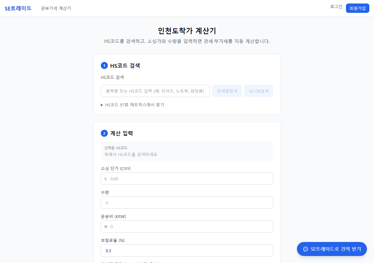 중국에서 수입할 때 관부가세부터 인천도착가까지 3분이면 계산 끝. 관세청 API 연동 HS코드 자동 조회, FTA 절감액 비교, 총 랜딩코스트까지 한 번에.